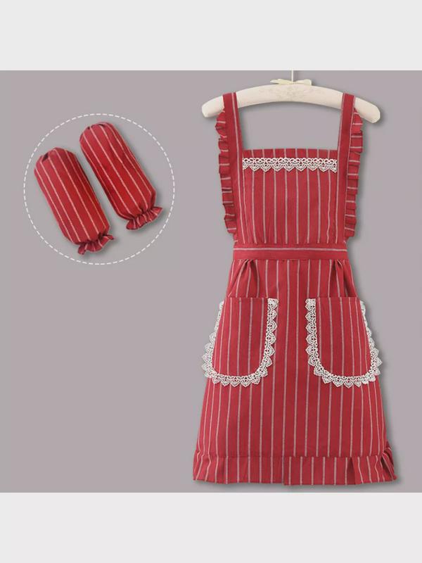 Фартук с нарукавниками и карманами кружевной в полоску хлопковый дышащий