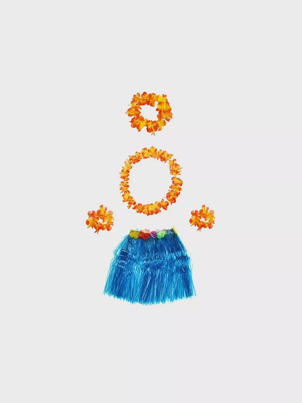 Гавайская юбка 40 см, цвет синий голубой, гавайский набор, цвет оранжевый, 4 предмета: ожерелье лея, венок, 2 браслета