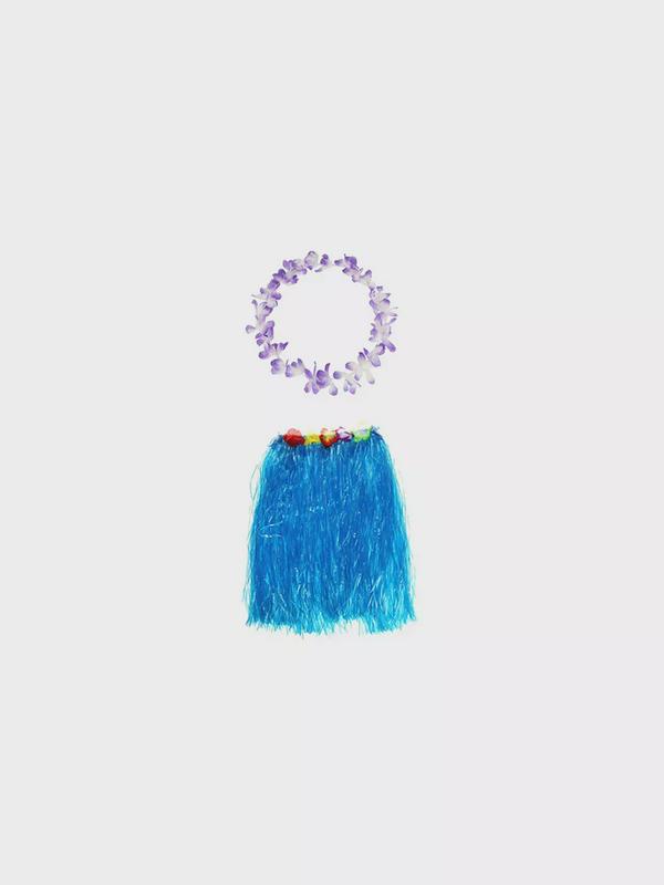 Гавайская юбка 60 см, цвет синий голубой, гавайское ожерелье "Двухцветные цветы", цвет бело-фиолетовый, сиреневый