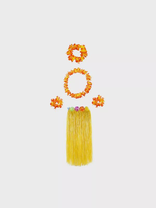 Гавайская юбка длинная желтая с цветочками, 80 см, гавайский набор, цвет оранжевый, 4 предмета: ожерелье лея, венок, 2 браслета