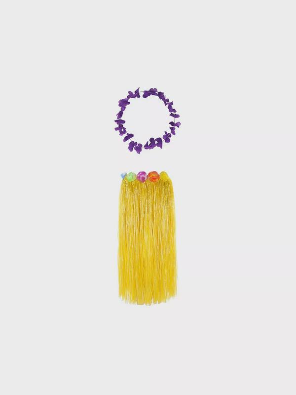 Гавайская юбка длинная желтая с цветочками, 80 см, гавайское ожерелье "Цветочки", цвет фиолетовый