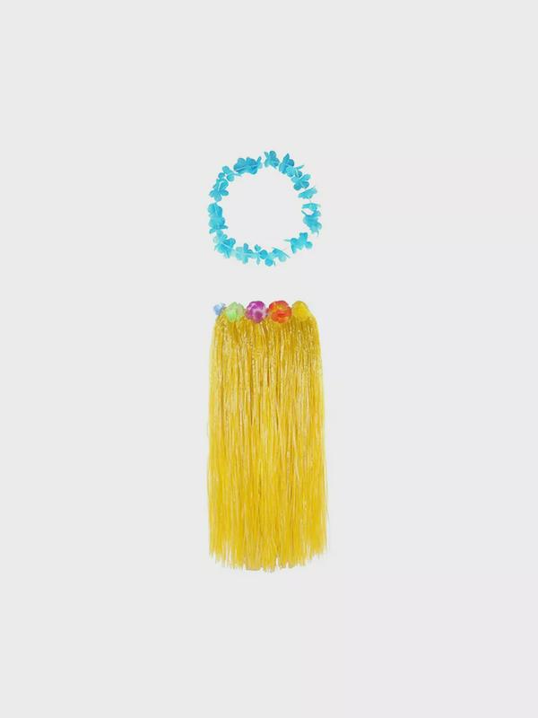 Гавайская юбка длинная желтая с цветочками, 80 см, гавайское ожерелье "Цветочки", цвет голубой