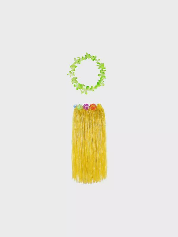 Гавайская юбка длинная желтая с цветочками, 80 см, гавайское ожерелье "Двухцветные цветы", цвет светло-зеленый, салатовый