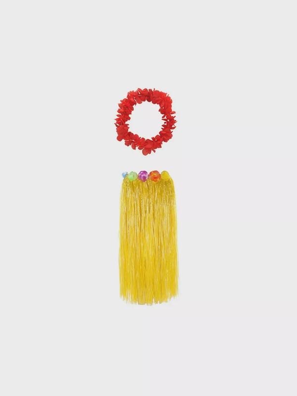Гавайская юбка длинная желтая с цветочками, 80 см, гавайское ожерелье "Пышное", цвет красный