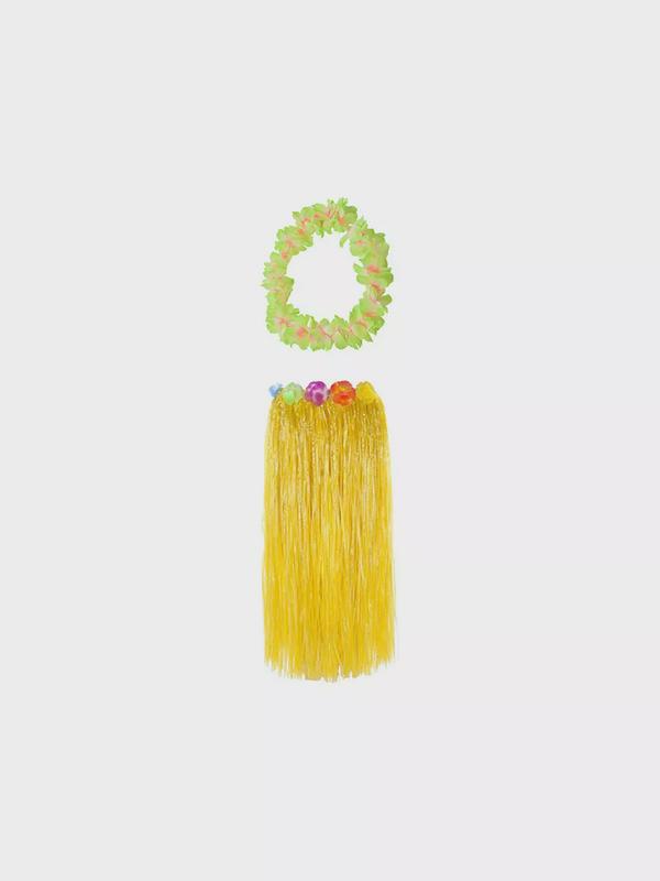 Гавайская юбка длинная желтая с цветочками, 80 см, гавайское ожерелье "Пышное салатовое"