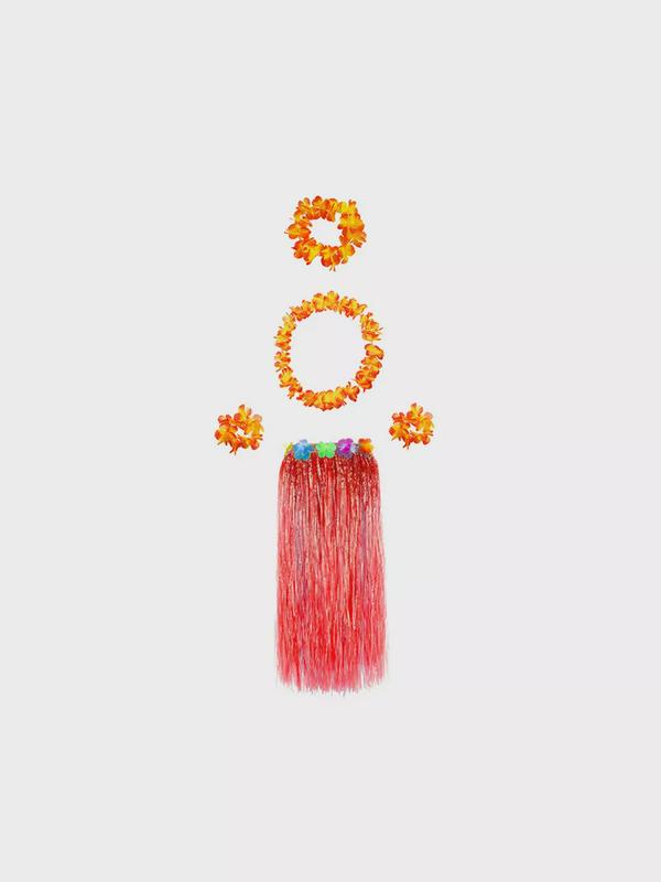 Гавайская юбка длинная красная с цветочками, 80 см, гавайский набор, цвет оранжевый, 4 предмета: ожерелье лея, венок, 2 браслета