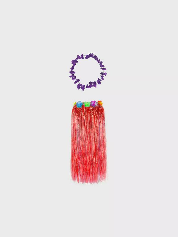 Гавайская юбка длинная красная с цветочками, 80 см, гавайское ожерелье "Цветочки", цвет фиолетовый