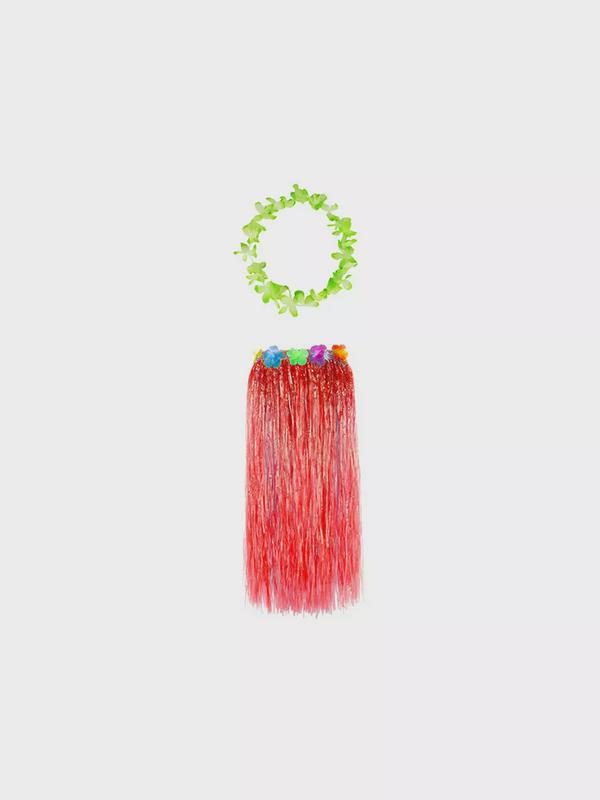 Гавайская юбка длинная красная с цветочками, 80 см, гавайское ожерелье "Двухцветные цветы", цвет светло-зеленый, салатовый