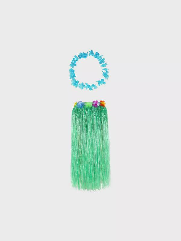 Гавайская юбка длинная зеленая с цветочками, 80 см, гавайское ожерелье "Цветочки", цвет голубой