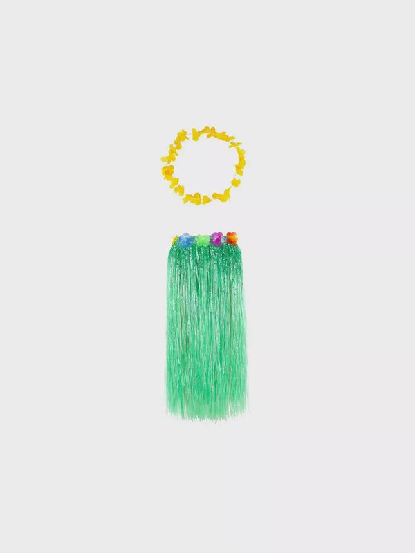 Гавайская юбка длинная зеленая с цветочками, 80 см, гавайское ожерелье "Цветочки", цвет желтый