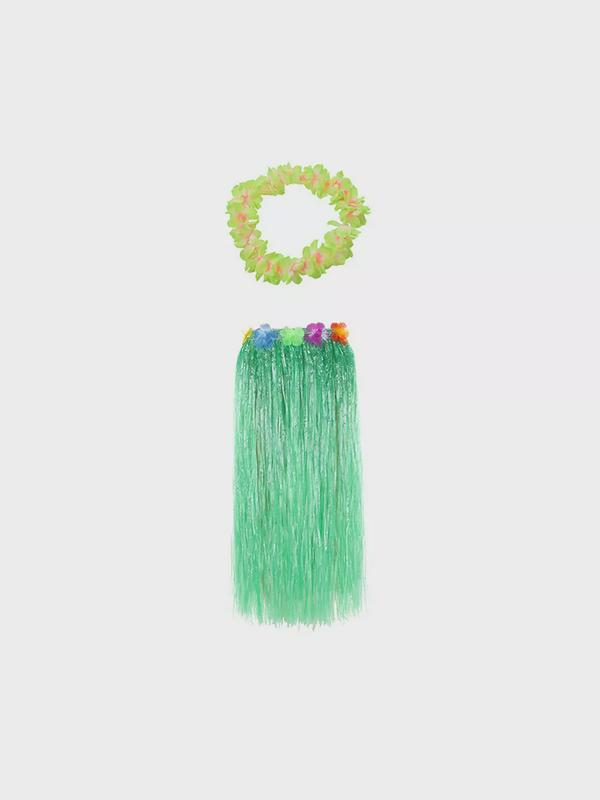 Гавайская юбка длинная зеленая с цветочками, 80 см, гавайское ожерелье "Пышное салатовое"