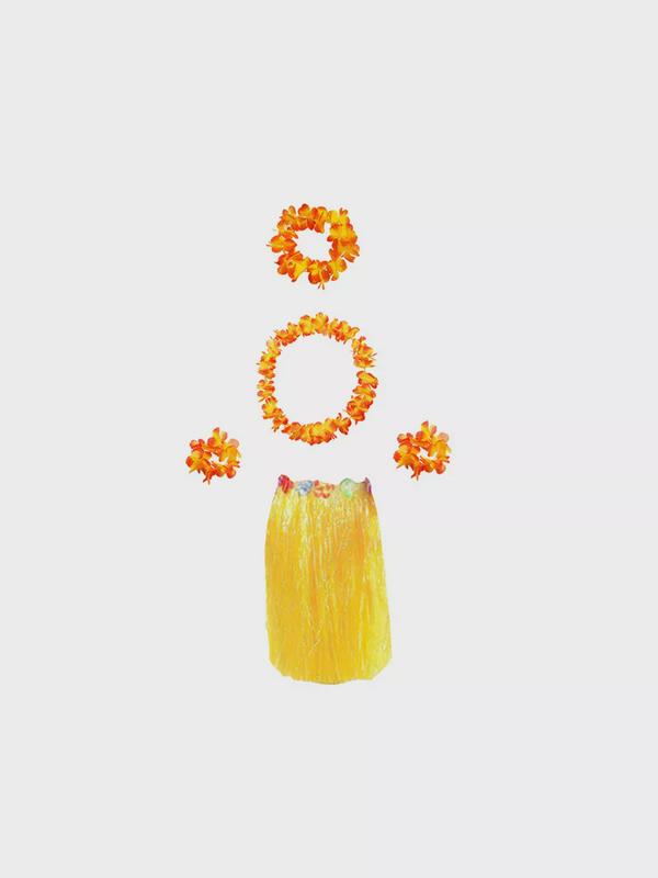 В набор входят 1 юбка, 1 ожерелье, 1 венок, 2 браслета. Длина резинки юбки в не растянутом состоянии 60 см. Юбка хорошо подстраивается под размер талии взрослых людей.
