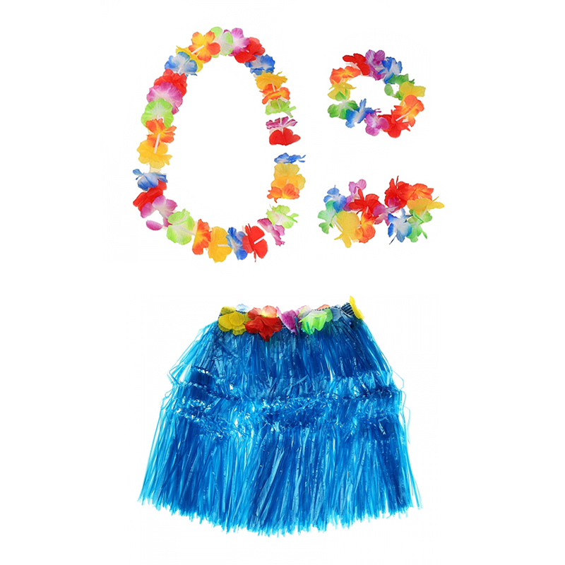 Гавайская юбка синяя 40 см, ожерелье лея 96 см, венок, 2 браслета (набор)