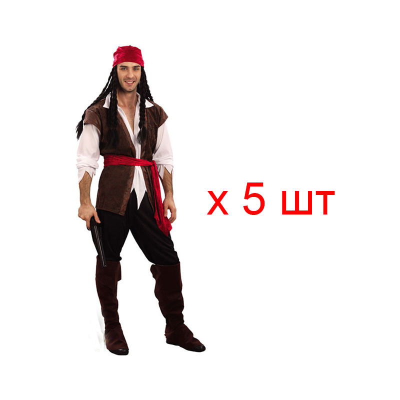 Карнавальный костюм пирата "Джек Воробей" мужской пиратский взрослый: бандана, рубашка, жилет, пояс, брюки, накладки (5 костюма в наборе)