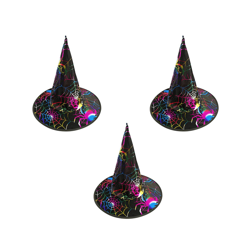 Колпак черный "Шляпа хэллоуин", костюм ведьмы с разноцветными пауками (Набор 3 шт.)