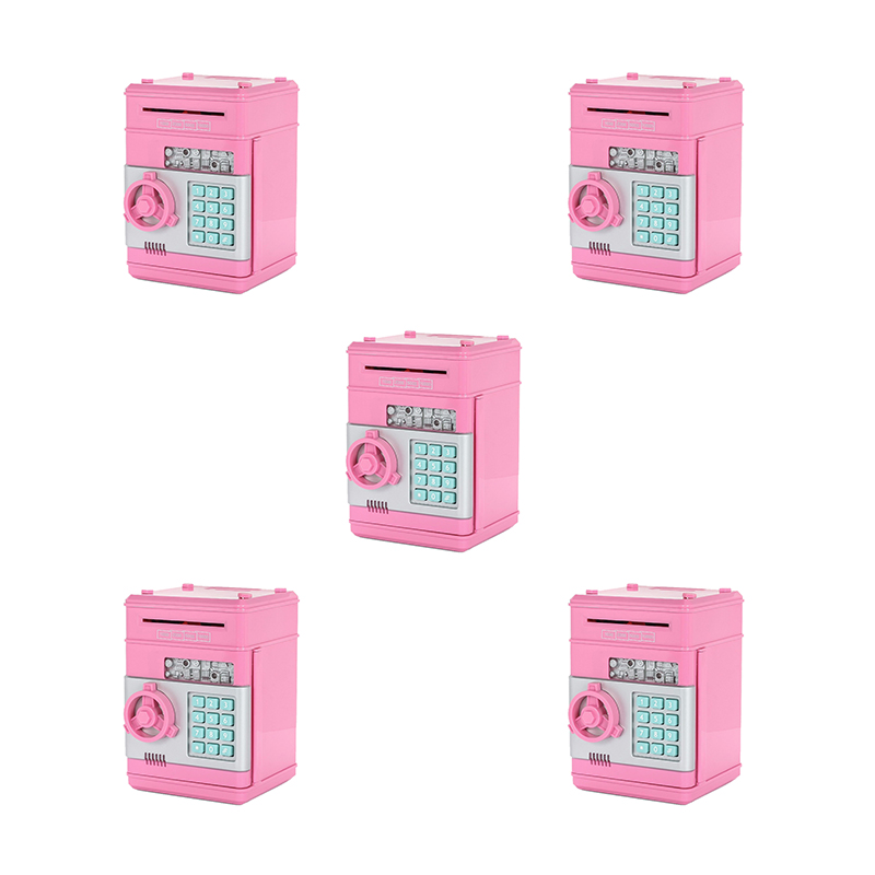 Копилка "Сейф" розовая интерактивная, банкомат для денег и монет с замком и купюроприемником (Набор 5 шт.)