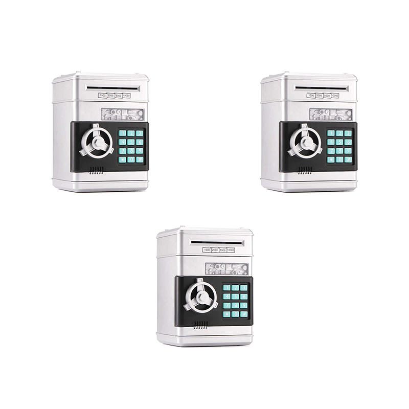 Копилка "Сейф" серебряная интерактивная, банкомат серебристый для денег и монет с замком и купюроприемником (Набор 3 шт.)