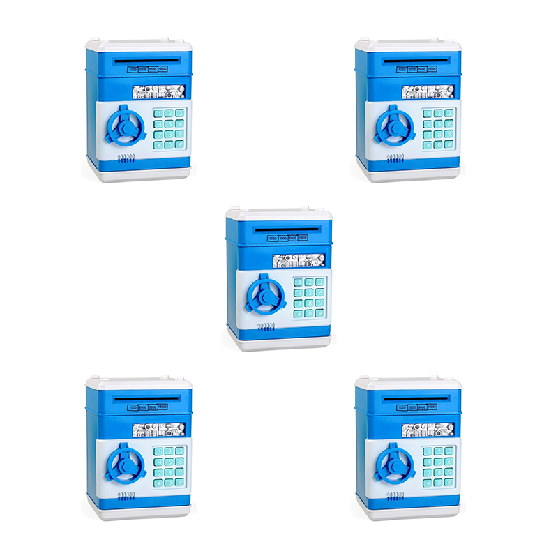Копилка "Сейф" синяя голубая интерактивная, банкомат для денег и монет с замком и купюроприемником (Набор 5 шт.)