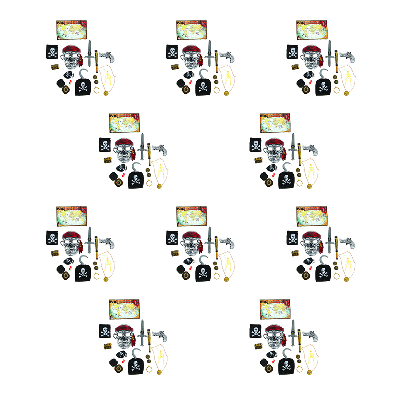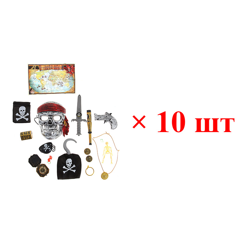Замечательный игровой набор с разнообразными пиратскими аксессуарами. В набор входят: пиратская маска череп, кинжал, бинокль, пистолет, медальон, монеты, серьга, маленький скелет, крюк, компас, маленький сундук, карта, мешочек для сокровищ.