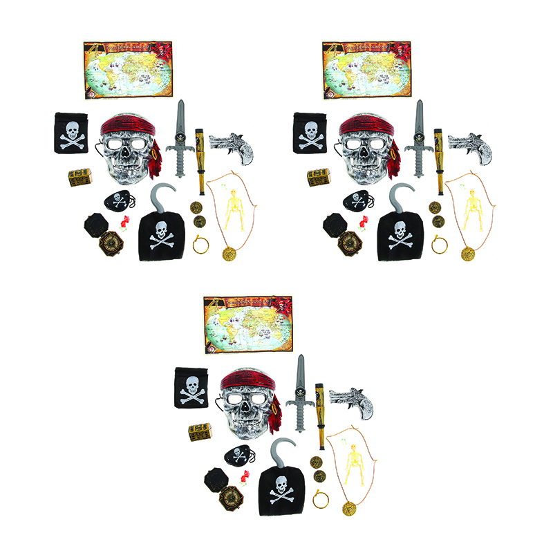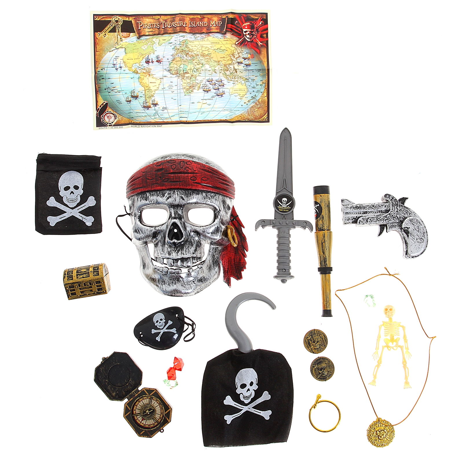 Замечательный игровой набор с разнообразными пиратскими аксессуарами. В набор входят: пиратская маска череп, кинжал, бинокль, пистолет, медальон, монеты, серьга, маленький скелет, крюк, компас, маленький сундук, карта, мешочек для сокровищ.