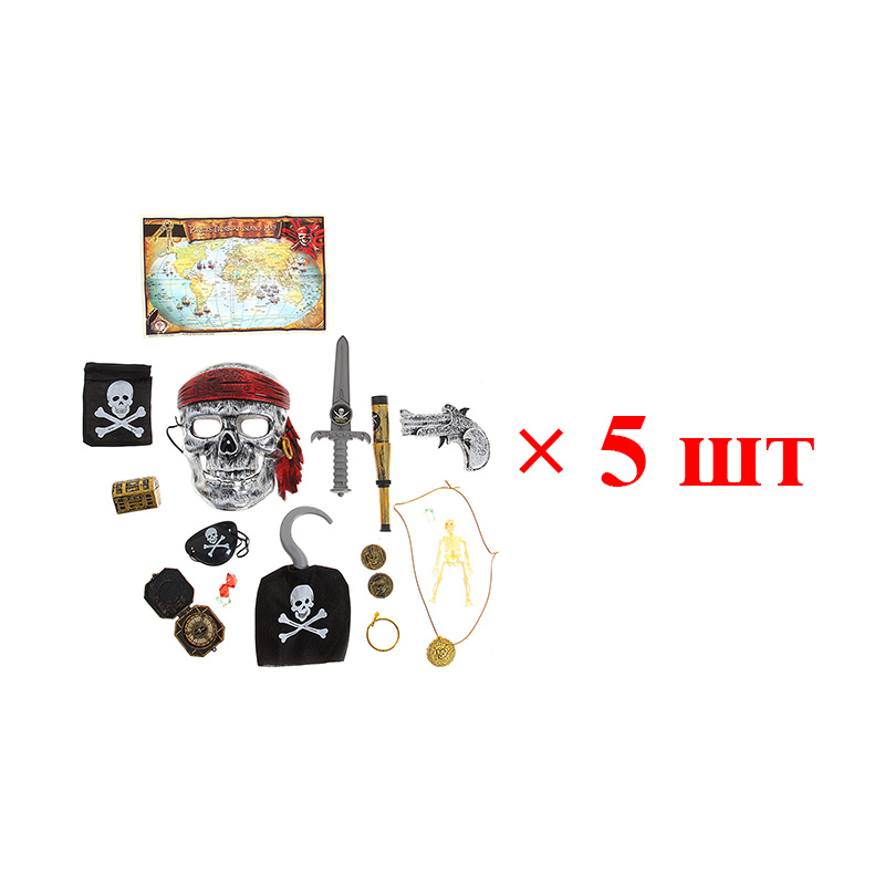 Замечательный игровой набор с разнообразными пиратскими аксессуарами. В набор входят: пиратская маска череп, кинжал, бинокль, пистолет, медальон, монеты, серьга, маленький скелет, крюк, компас, маленький сундук, карта, мешочек для сокровищ.