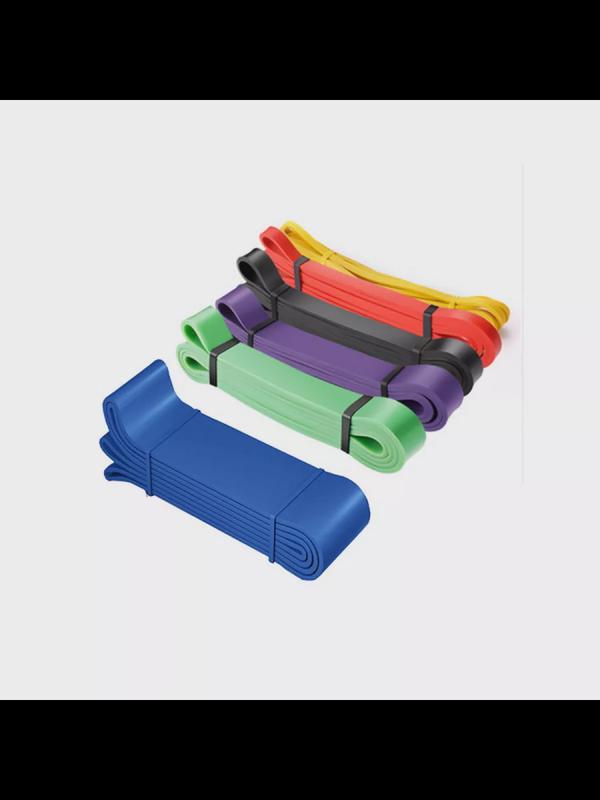 В наборе 6 лент разных нагрузок и цветов: желтая лента с нагрузкой 8 кг, красная лента - 10 кг, черная лента - 15 кг, фиолетовая лента - 19 кг, зеленая лента - 35 кг и синяя - 55 кг.