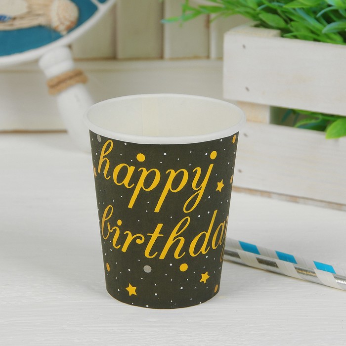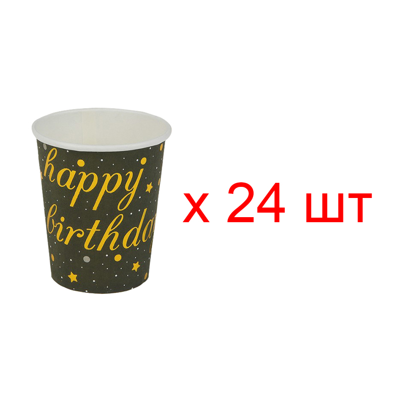 Стакан бумажный одноразовый "С Днем Рождения" 225 мл, цвет черный (Набор 24 шт.)