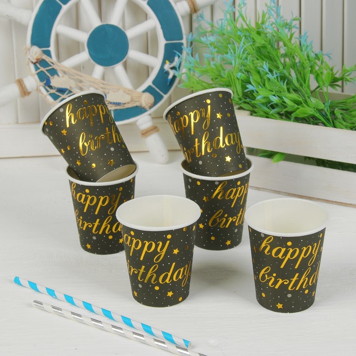 Стакан бумажный одноразовый "С Днем Рождения" 225 мл, цвет черный (Набор 30 шт.)