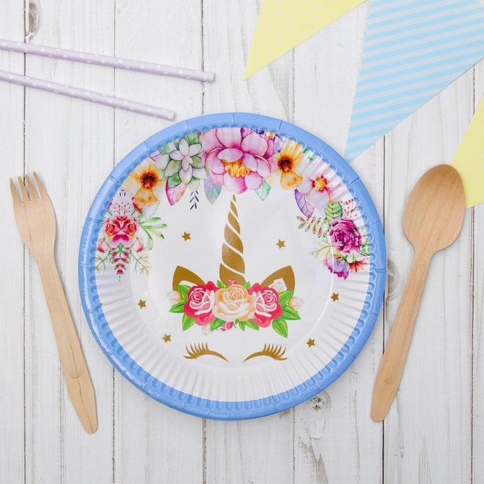 Тарелка бумажная одноразовая "Единорог и цветы" (Набор 12 шт.)